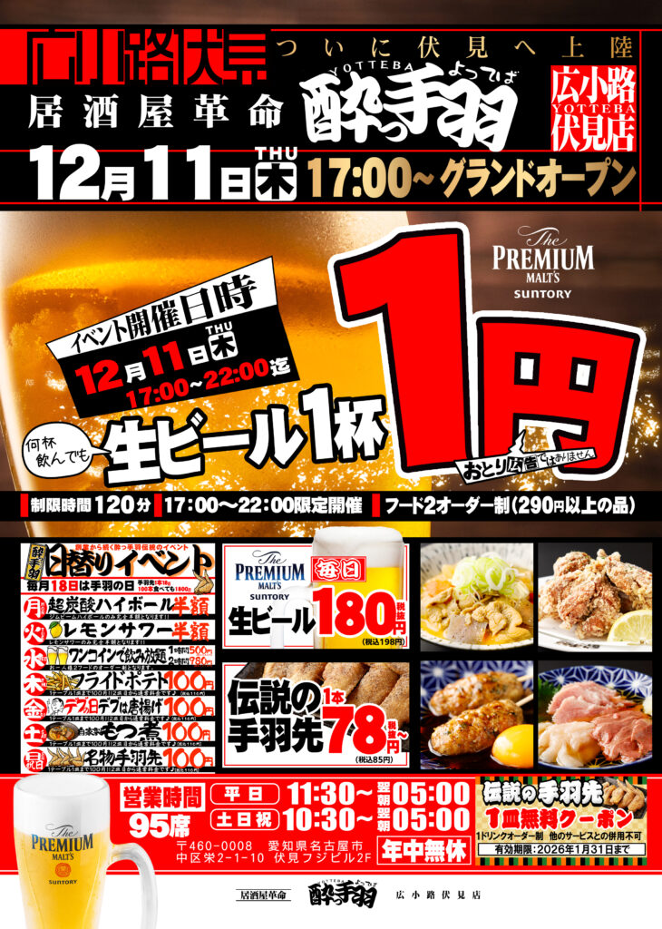 S.H.N株式会社の傘下、株式会社プロジェクトMが展開する人気居酒屋ブランド「居酒屋革命 酔っ手羽」が、2025年12月11日(木) 17時、広小路伏見店にオープンいたします。