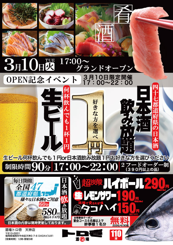 S.H.N株式会社(本社:東京都渋谷区、代表取締役社長:髙橋竜太)は、2025年11月にオープンした居酒屋ブランド「トロ壱(とろいち)」の第2号店を、2026年3月10日(火)に福岡天神へオープンいたします。